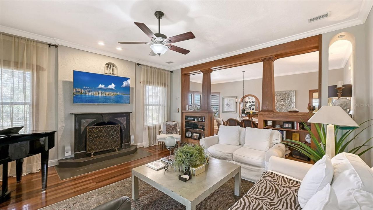 A rare opportunity to own a single-family residence in Sarasota's highly sought-after Rosemary District. Set on a beautifully landscaped property, this home features a towering century-old oak tree that anchors the backyard and creates a distinctive outdoor setting rarely found in downtown locations.Spanish and Mediterranean architectural elements introduce the residence, offering classic Old World character paired with solid construction and an elevation of approximately 25 feet above sea level. The property is located in Flood Zone X, where flood insurance is not required.Inside, the home features high ceilings, hardwood flooring and extensive crown molding throughout. A gas fireplace adds warmth and character to the living area during cooler winter evenings. Multiple windows allow natural light to flow throughout the interior spaces.The residence includes three bedrooms, with one currently configured as an office or study and featuring a separate exterior entrance, offering flexibility for work-from-home use or private guest access.Outdoor living spaces include a spacious garden area, an oversized patio and a pergola surrounded by mature landscaping, creating a private setting for dining and entertaining.Located in the heart of the Rosemary District, the home places residents within close proximity to many culinary delights, Sarasota's cultural amenities, including galleries, theaters and live music venues. More than 65 restaurants, caf?s and shops are located within approximately six block radius.The Bay Park waterfront district, a 53-acre public park along Sarasota Bay, is just five blocks away. Payne Park, the Legacy Trail for walking and biking, the Sarasota Farmers Market and Whole Foods Market are all nearby. The John Ringling Bridge provides convenient access to St. Armands Circle and Lido Beach.The property is zoned DTE, which offers future redevelopment potential, subject to city approvals. Owners may choose to enjoy the residence as a private downtown home while maintaining long-term flexibility for future planning. Or alternatively, since this is DTE zoning, this is perfect property for a restaurant possibility - just something else to consider!A unique opportunity to experience downtown Sarasota living in one of the city's most vibrant and evolving neighborhoods.